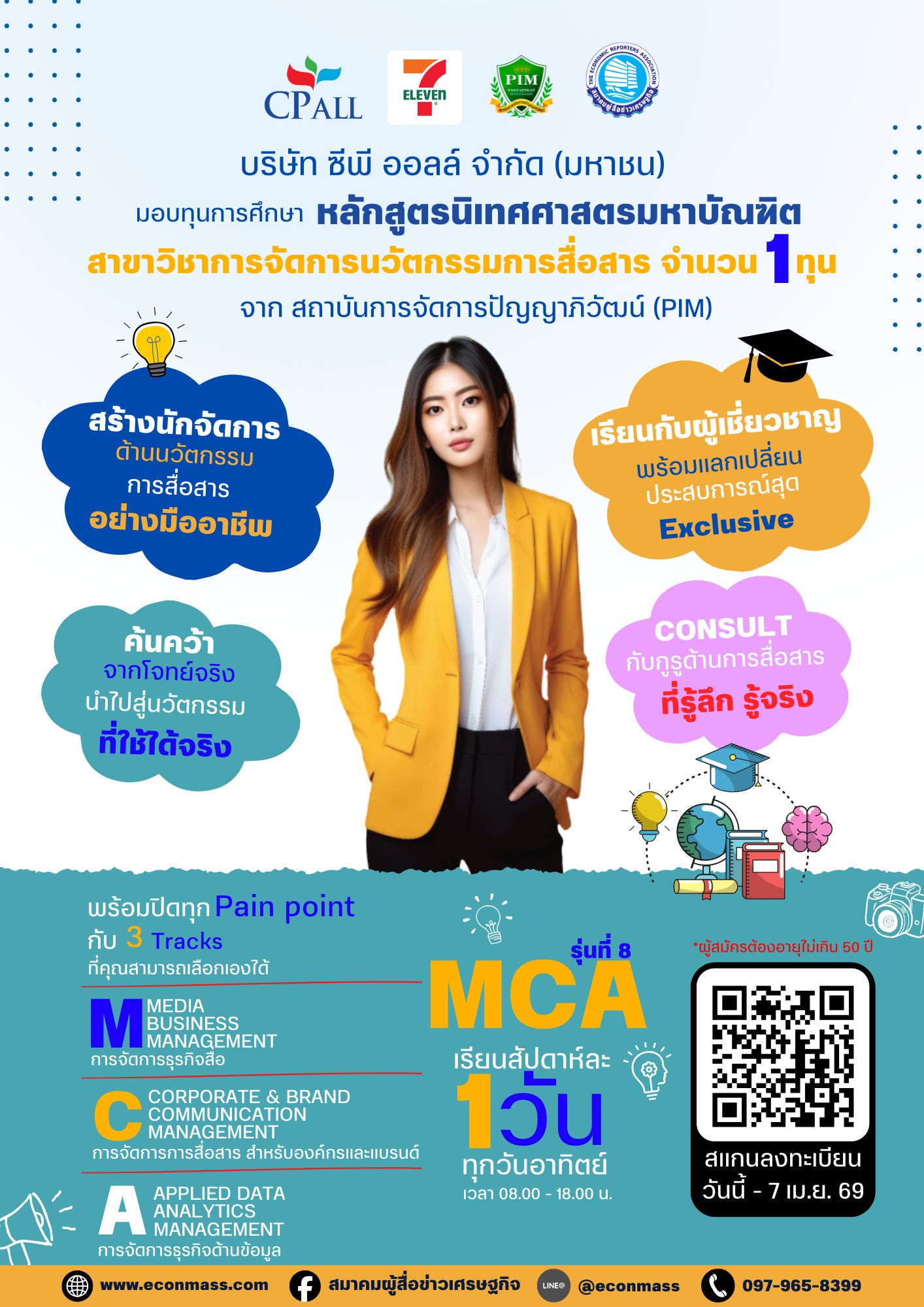 บริษัท ซีพี ออลล์ จำกัด (มหาชน) มอบทุนการศึกษาหลักสูตรนิเทศศาสตรมหาบัณฑิต สาขาวิชาการจัดการนวัตกรรมการสื่อสาร (MCA) รุ่นที่ 8 จาก สถาบันการจัดการปัญญาภิวัฒน์ (PIM) ให้สมาชิกสมาคมผู้สื่อข่าวเศรษฐกิจ จำนวน 1 ทุน